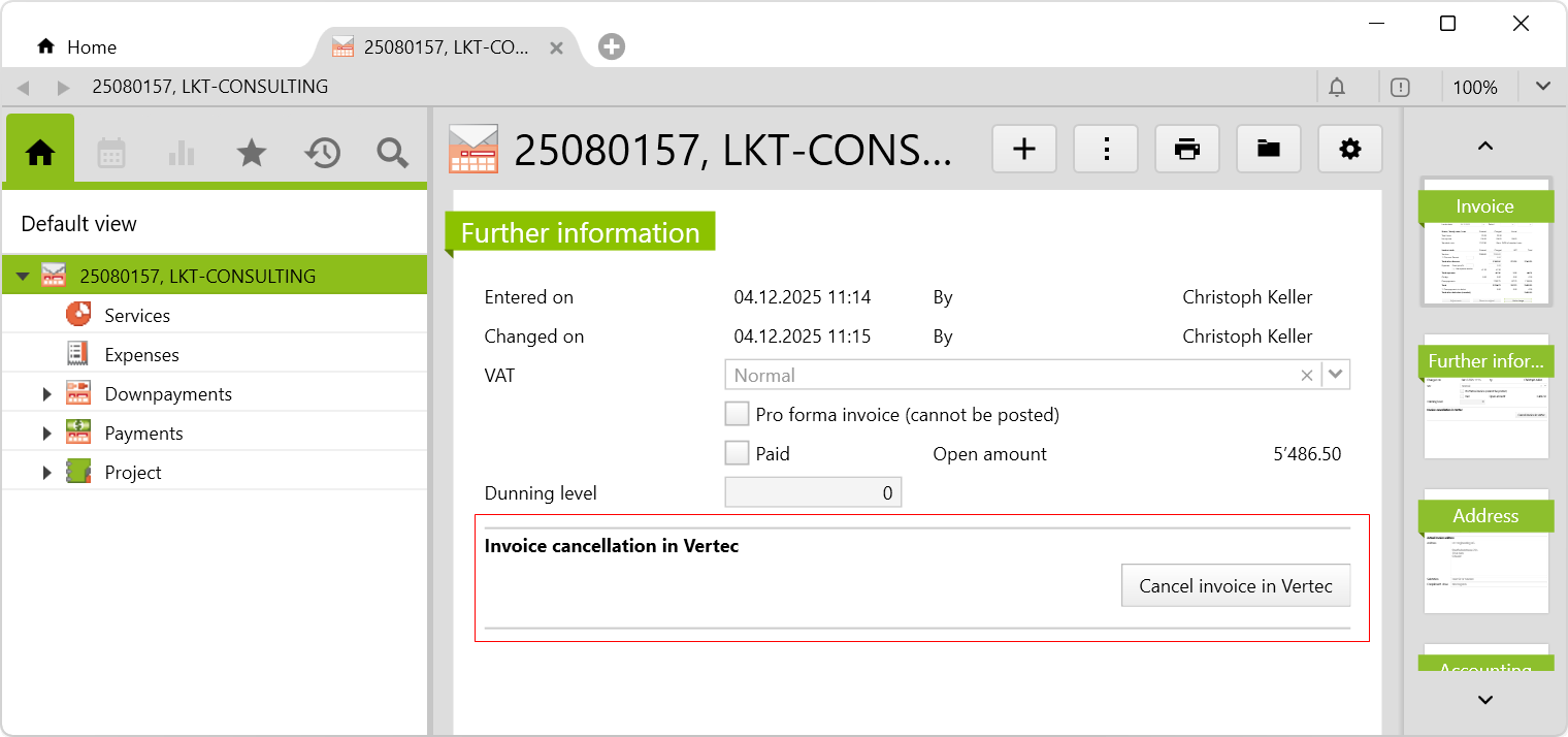 As soon as an invoice is charged is charged, the Invoice cancellation section in Vertec will appear on the More Info page: