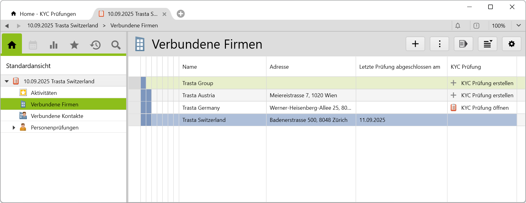 Die KYC-Funktion ermöglicht zudem die einfache Verwaltung verbundener Firmen und Kontakte. Alle relevanten Firmen, die mit einem Mandat verknüpft sind, können bequem im Unterordner „Verbundene Firmen“ eingesehen werden. Von hier aus lassen sich neue KYC-Prüfungen direkt starten oder bereits durchgeführte Prüfungen öffnen, ohne dass man zwischen verschiedenen Systemen wechseln muss.