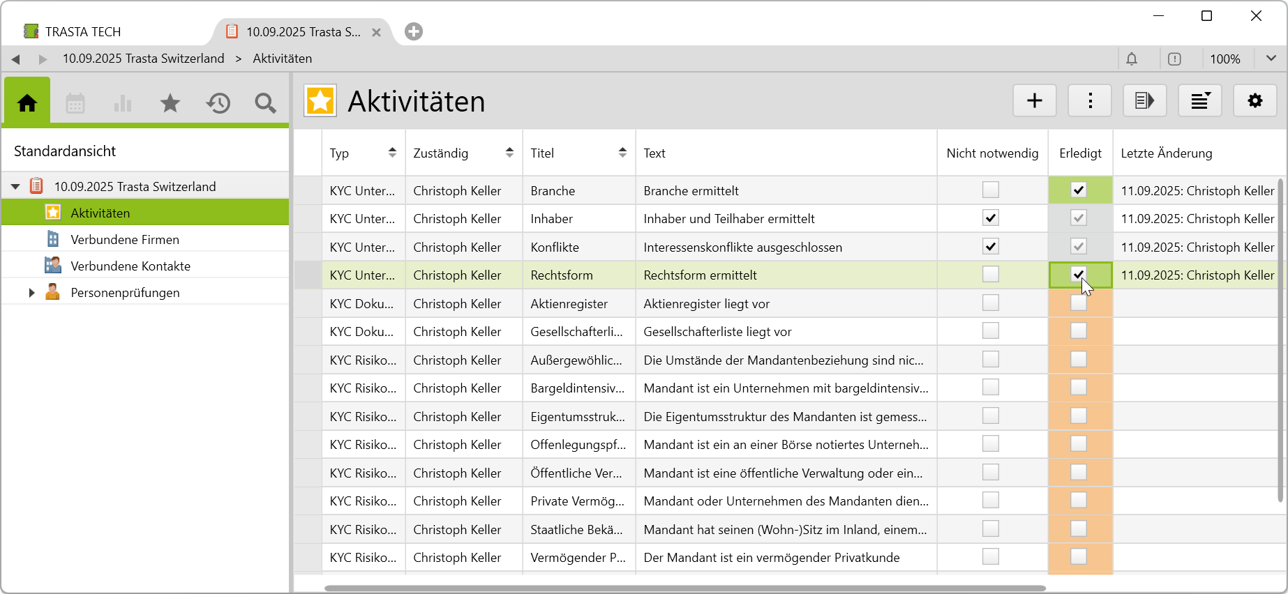 In der Liste der Aktivitäten können die einzelnen Punkte über eine Checkbox als „Nicht notwendig“ oder „Erledigt“ markiert werden. Neben der Checkbox sehen Sie sofort, wer wann die Aufgabe aktiviert hat, und es lassen sich zusätzliche Bemerkungen hinterlegen.