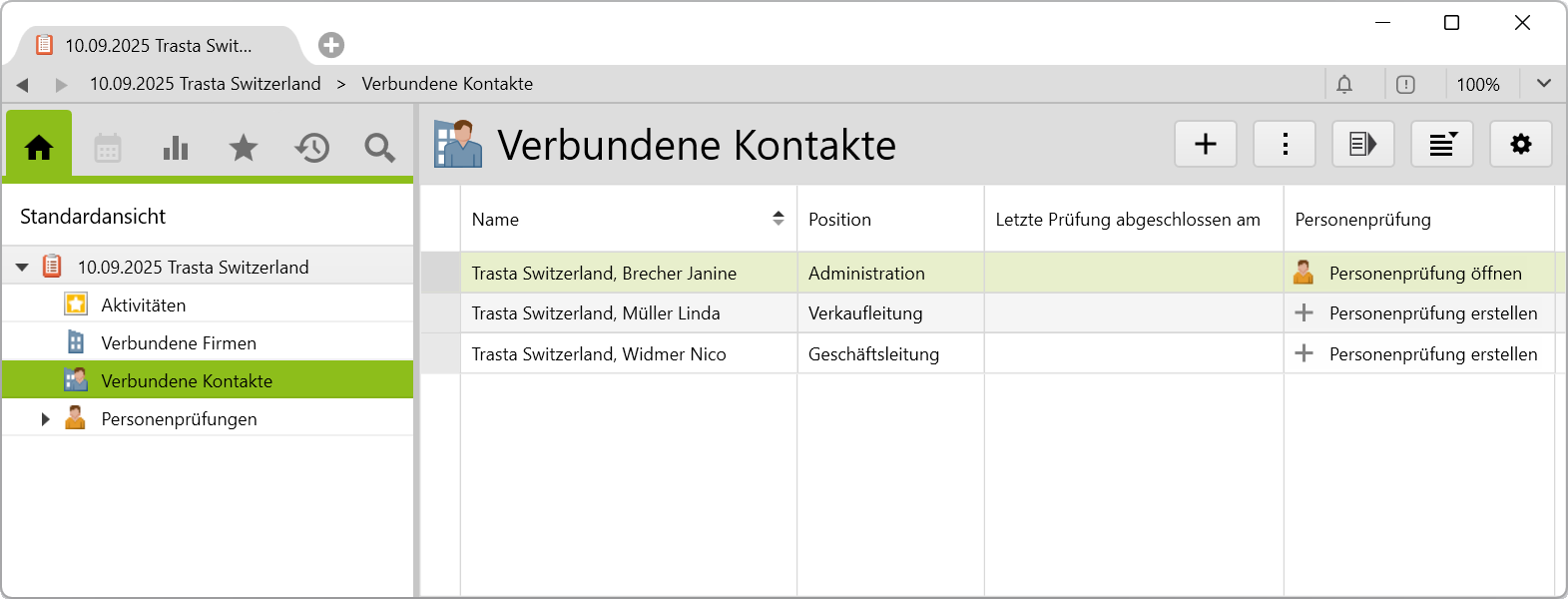 Auch die mit den Firmen verknüpften Kontakte sind jederzeit sichtbar – inklusive Position und bisheriger Prüfungen. So wissen Sie sofort, welche Personen bereits geprüft wurden und welche Schritte noch offen sind.
