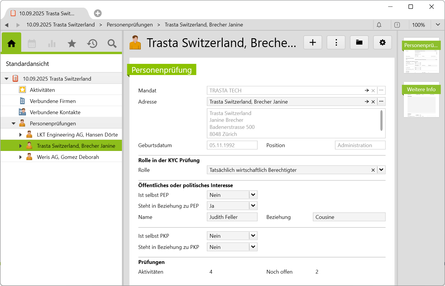 Für jeden Kontakt kann bei Bedarf eine Personenprüfung angelegt werden. Auf Basis der gewählten KYC-Vorlage wird automatisch eine Aktivitätenliste erstellt, die alle notwendigen Prüfschritte enthält.