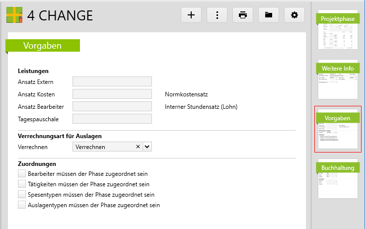 Weiter können die Ansätze der erfassten Leistungen, Spesen und Auslagen angegeben bzw. definiert werden, ob der Bearbeiter, der auf dieser Phase erfasst, darauf einen speziellen Stundensatz haben soll (siehe zu diesem Thema den Artikel Tarifsystem). Diese Übersteuerungen gelten auch für alle Subphasen einer Phase.