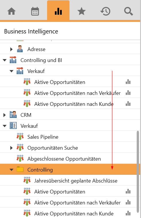 Das Config Set implementiert die Unterordner Aktive Opportunitäten, Aktive Opportunitäten nach Verkäufer und Aktive Opportunitäten nach Kunde. Diese befinden sich sowohl im Ordner Verkauf als auch im Ordner Controlling und BI: