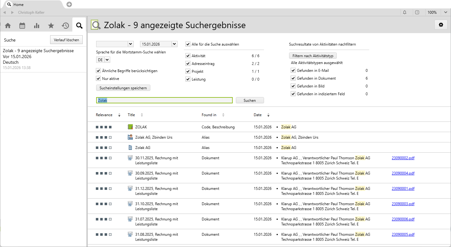 Globalisierung. Wird in der Suche global eingegeben, findet die Suche nichts, global* hingegen findet die entsprechende Aktivität.0018 nichts. Die Suche nach *0018 hingegen findet Aktivitäten und Rechnungen in Verbindung mit der gesuchten Rechnungsnummer: