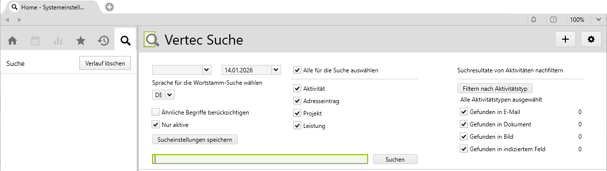 Ein Klick auf die Lupe im Navigationsmenü (oder die Funktionstasten F6 und F12) öffnet die Vertec Suchseite: