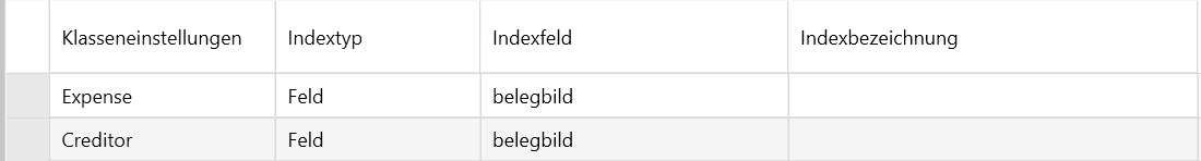 Ab Version 6.8.0.18 ist es möglich Belege (Bilder & PDFs) in Spesen und Kreditoren zu indizieren. Auch für diese Klassen werden üblicherweise Indexfelddefinitionen erfasst, die wie folgt aufgebaut sind:
