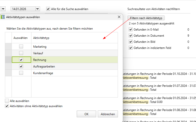 Suchresultate von Aktivitäten nachfiltern |