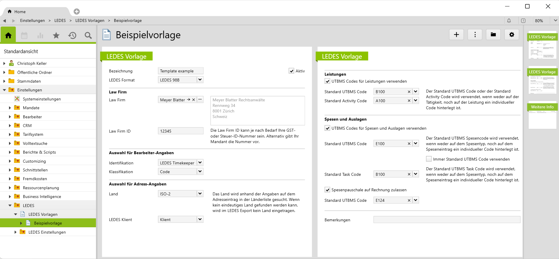 International tätige Anwaltskanzleien kennen das Problem: Vor allem in englischsprachigen Ländern wie den USA oder Grossbritannien sind E-Rechnungen der Standard. Kanzleien müssen ihre Honorarnoten daher meist im sogenannten LEDES Format (E-Billing) über eine Plattform stellen. Mit dieser Zusatzfunktion lassen sich kundenspezifische LEDES Vorlagen anlegen und Honorarnoten im LEDES Format exportieren.