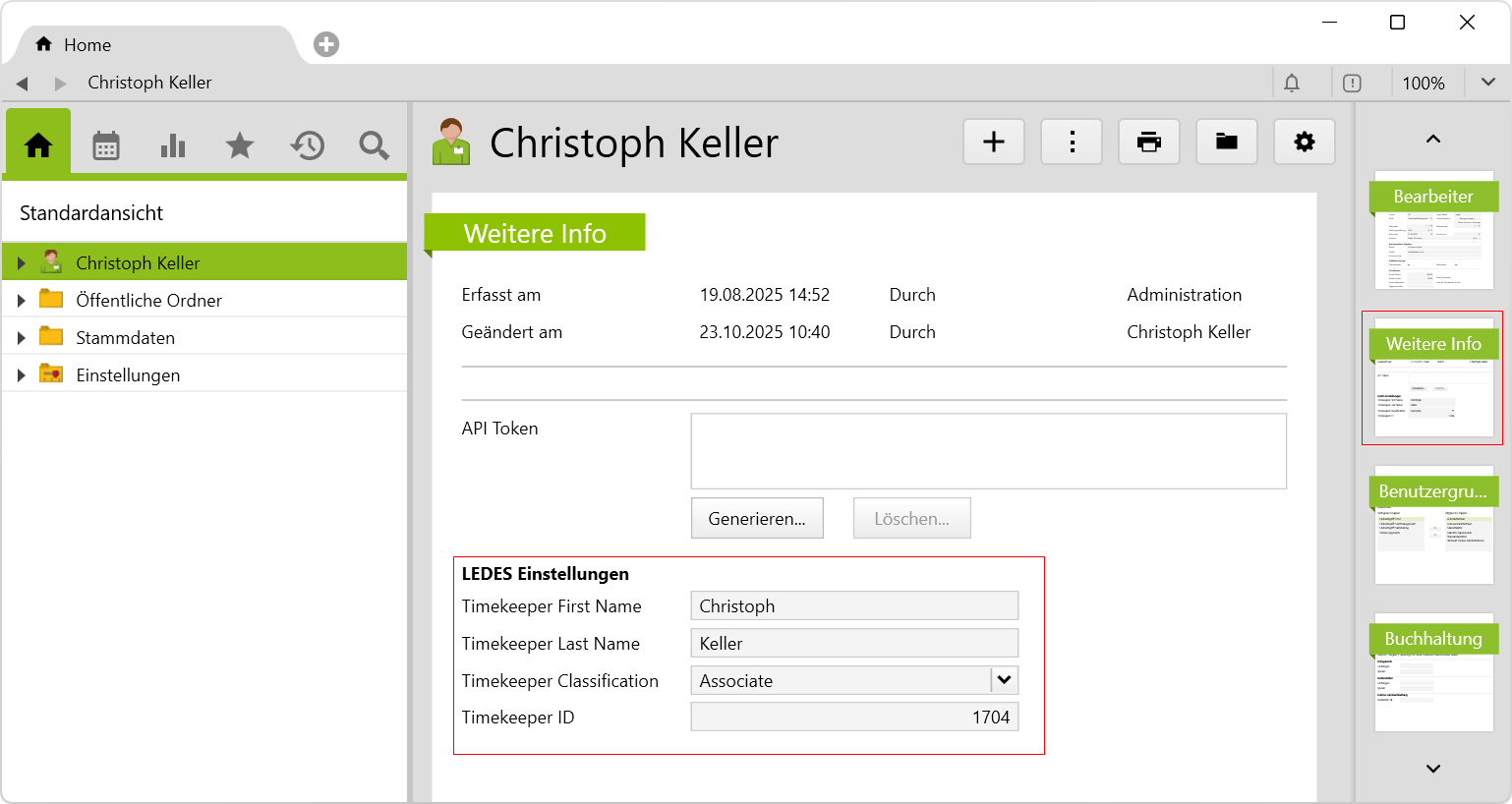 • LEDES Timekeeper ID: Feld Timekeeper ID auf dem Bearbeiter. Hier ist standardmässig die Objekt-ID des Bearbeiters eingetragen.