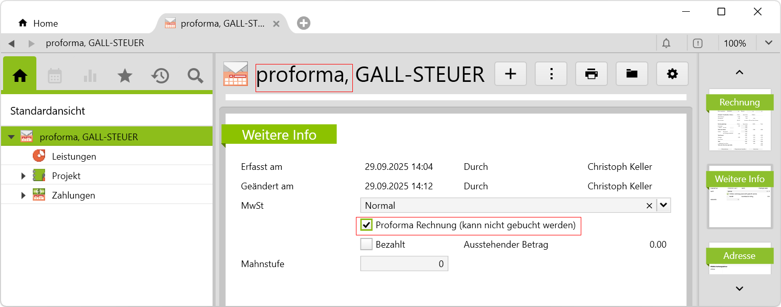 Beim Anklicken des Proforma-Häckchens auf der Seite Weitere Info wechselt die Rechnungsnummer von provisorisch
