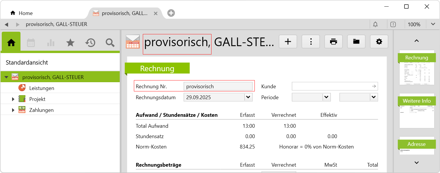 Vor dem Verrechnen steht anstelle der Rechnungsnummer provisorisch