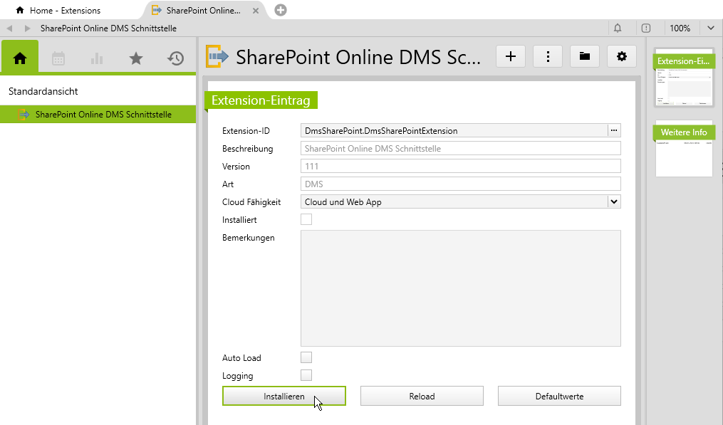 Durch Doppelklick öffnet sich die Einzelmaske. Um die Schnittstelle zu installieren, klicken Sie auf den Button Installieren:
