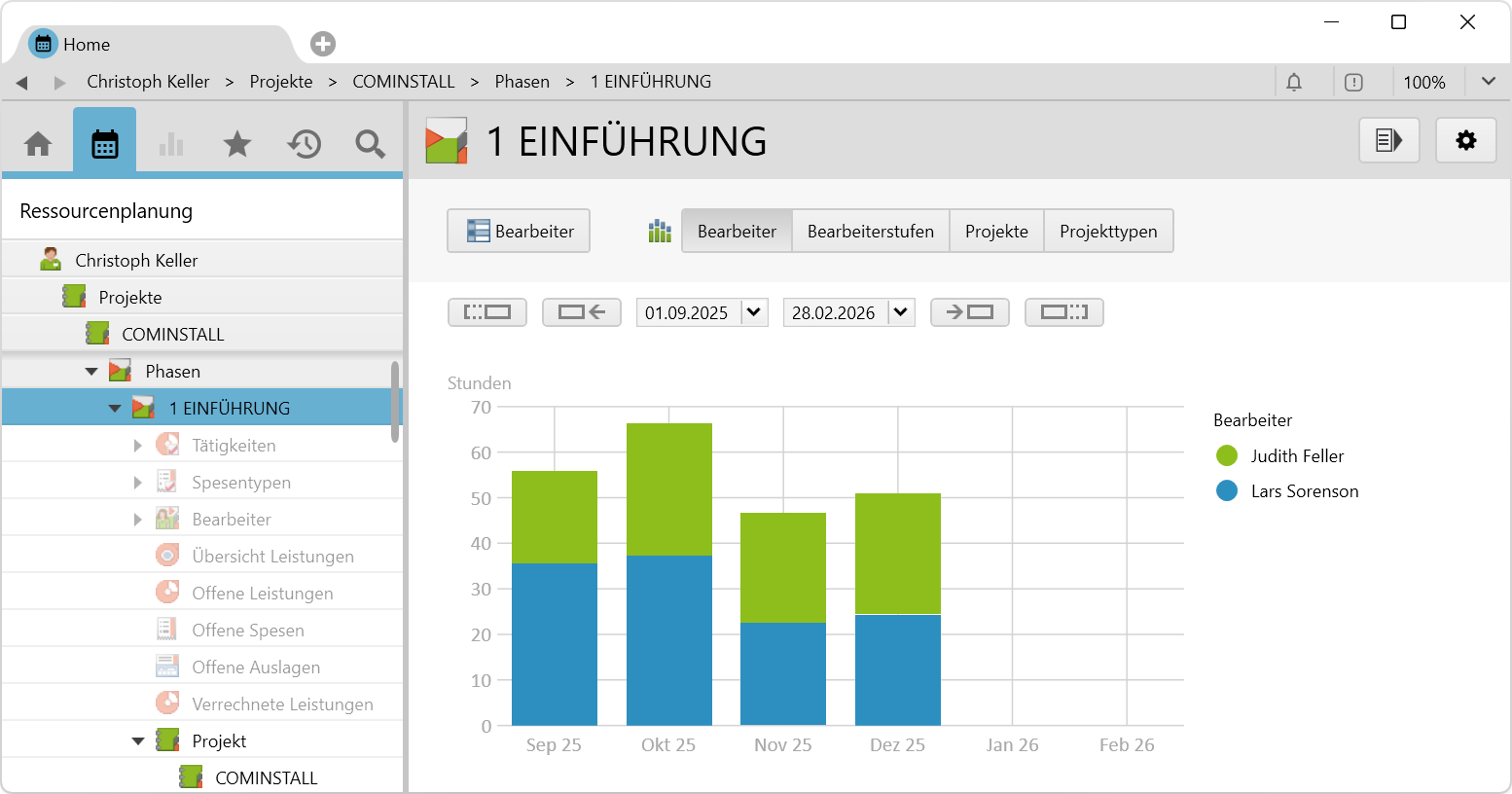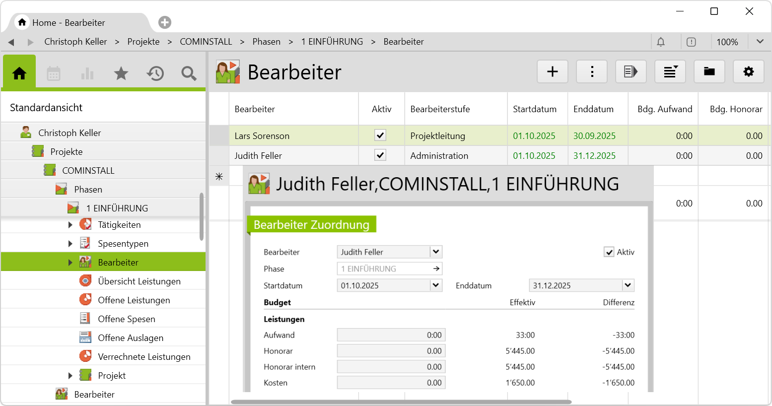 auf der Phase kann durch individuelle Angaben auf dem Bearbeiter-Phase-Link überschrieben werden. Es muss jedoch zwingend ein Start- und Enddatum angegeben werden.Auf der Zuordnung eines Bearbeiters zu einer Phase wird ein Aufwands-Budget gesetzt. Hier im Beispiel wird Lars Sorenson für die Einführunsphase vom 01.09.2025 – 31.12.2025 für 120 Stunden verplant, Judith Feller für 100 Stunden in der individuellen Zeitspanne vom 01.09.2025 – 31.12.2025.