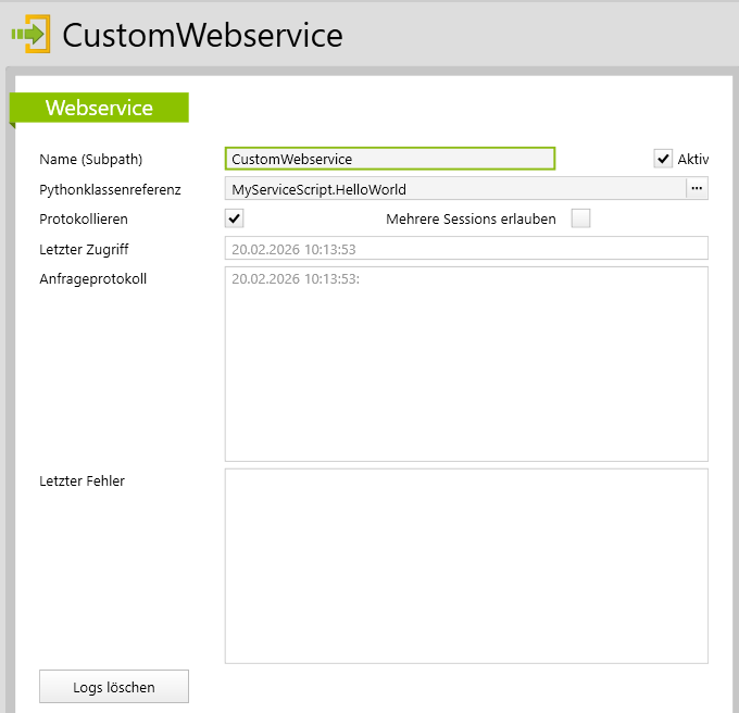 Wenn diese Checkbox aktiv ist, dann werden die print und self.log Meldungen sowie Zeitangaben des Webservices in das Feld Anfrageprotokoll angezeigt. Dies hilft beim Einrichten und Austesten des Webservices. Für den Normalbetrieb kann die Checkbox deaktiviert werden.
