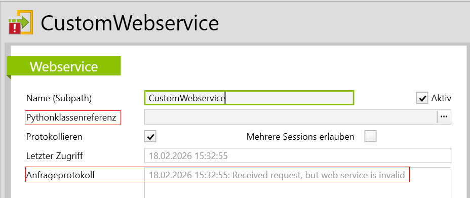 Eine leere oder fehlerhafte Pythonklassenreferenz führt dazu, dass der Eintrag als ungültig angezeigt wird und beim Versuch, den Webservice anzusprechen, wird der Status 404 NOT Found zurückgegeben. Wenn zuvor das Feld Protokollieren aktiviert wurde, erscheint ein Hinweis unter Anfrageprotokoll bei invalidem Webservice: