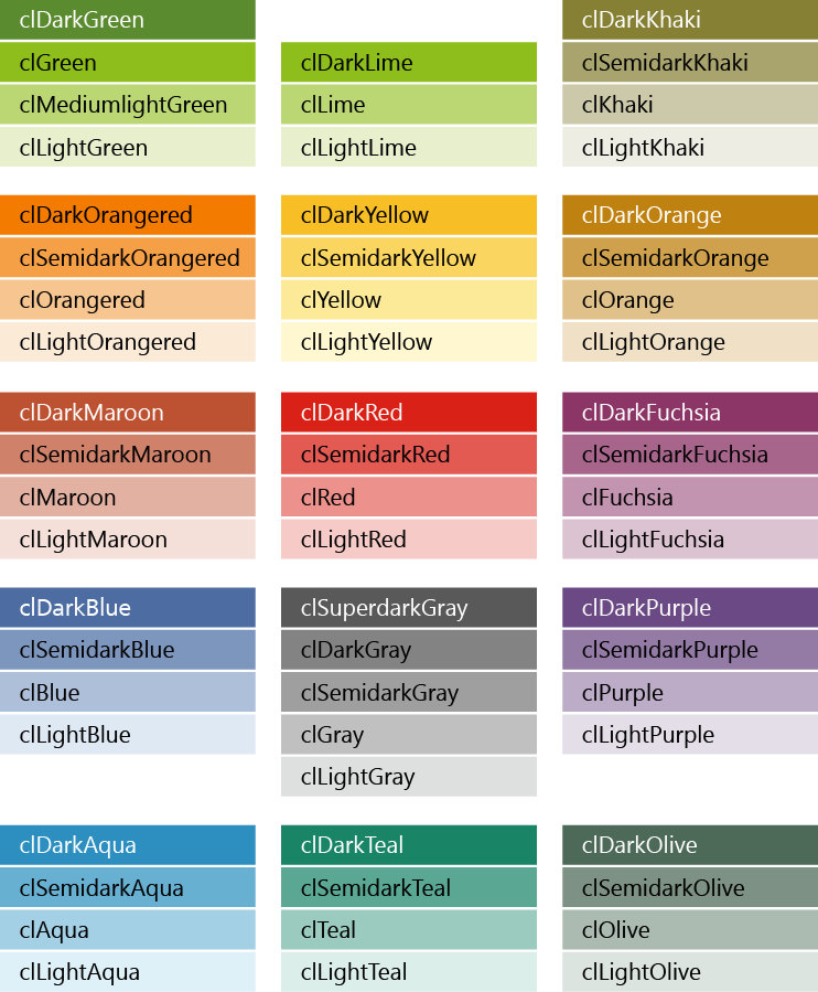 ![]() Für eine harmonische Darstellung werden bei den Farben in den neuen Apps (Desktop App, Cloud App und Web App) nur die Farben der Vertec Farbpalette unterstützt. Diese besteht aus 15 Farben in jeweils 3 Abstufungen plus Black and White. Die Vertec FarbpaletteAls Farbnamen unterstützt werden die in der nachfolgenden Tabelle aufgelisteten Farbnamen. Die Farbpalette wurde mit Vertec Version 6.6 ergänzt. Die vor Version 6.6 unterstützten Farben finden Sie weiter unten. ![]() Aufbau von OCL Expressions für FarbenBeispiel für eine Farb-OCL-Expression auf einer Liste von Rechnungen: