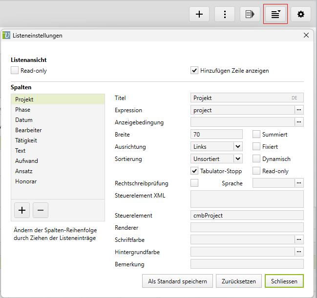 Im Feld Steuerelement kann der Name eines Steuerelements hinterlegt werden, im Bild oben z.B. das Steuerelement cmbProjekt für die Spalte Projekt der Leistungsliste. Dieses bewirkt, dass in der Leistungsliste für die Auswahl des Projekts ein Drop-Down-Menü erscheint: ![]() Eine Liste aller verfügbaren Steuerelemente finden Sie hier. |