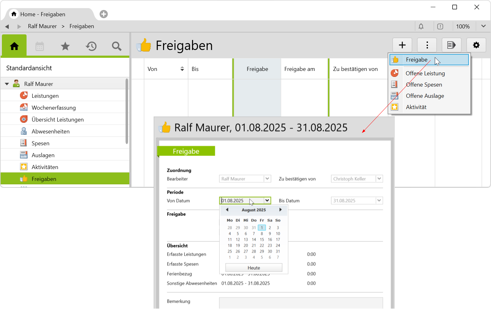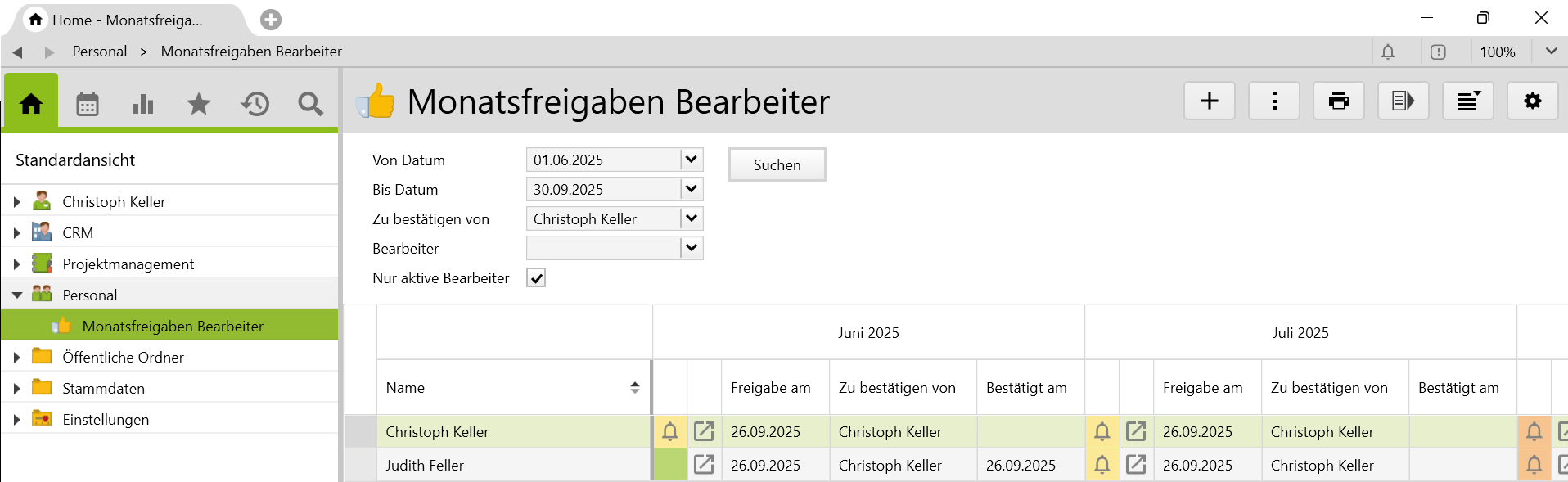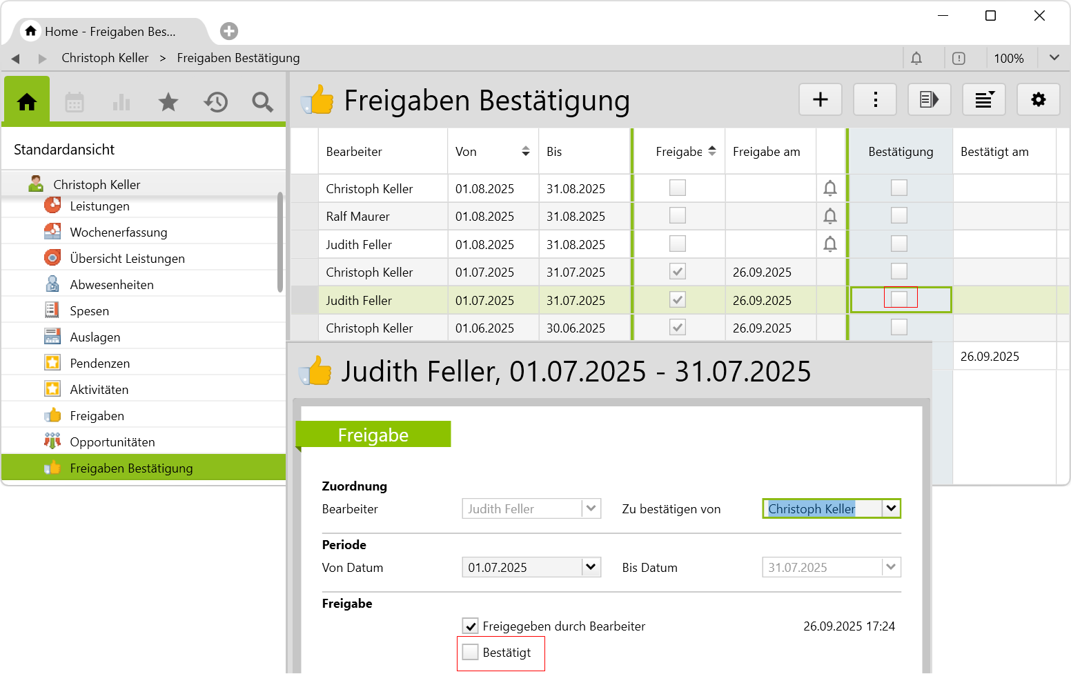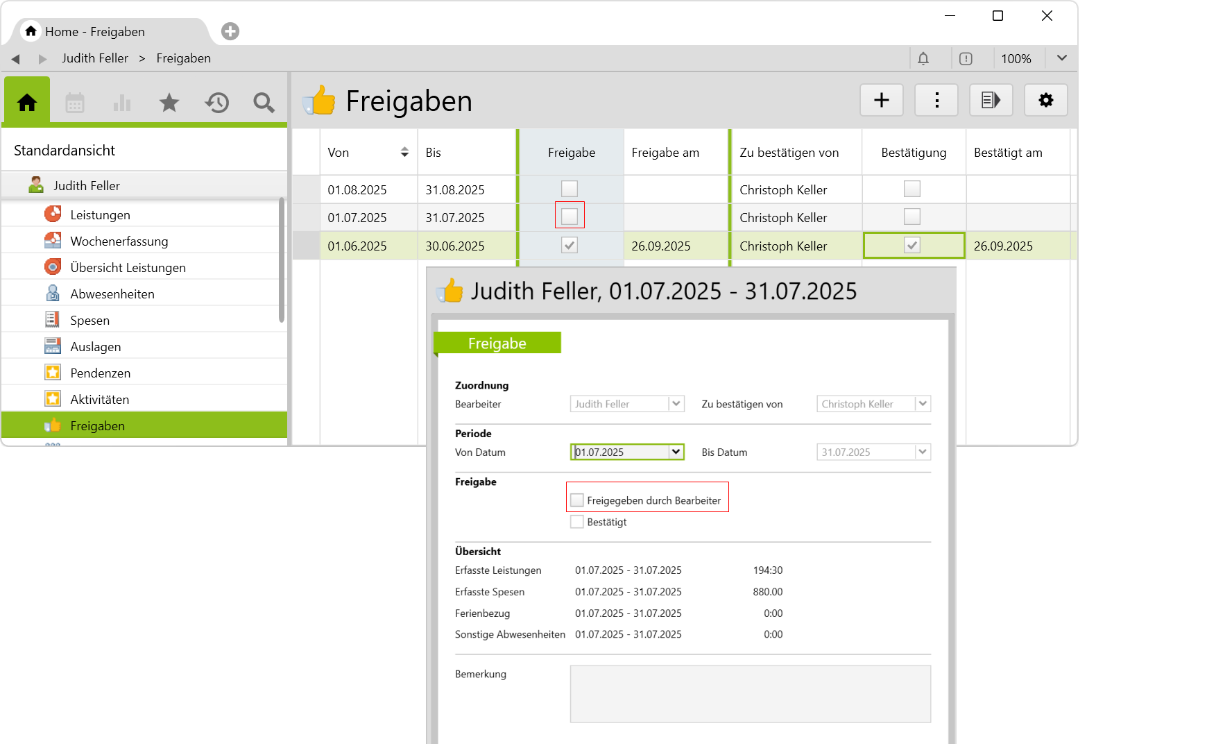 Diese Zusatzfunktion implementiert einen Workflow für die monatsweise Freigabe von Leistungen, Spesen, Auslagen und Abwesenheiten durch die Bearbeiter sowie durch ihre Teamleiter.