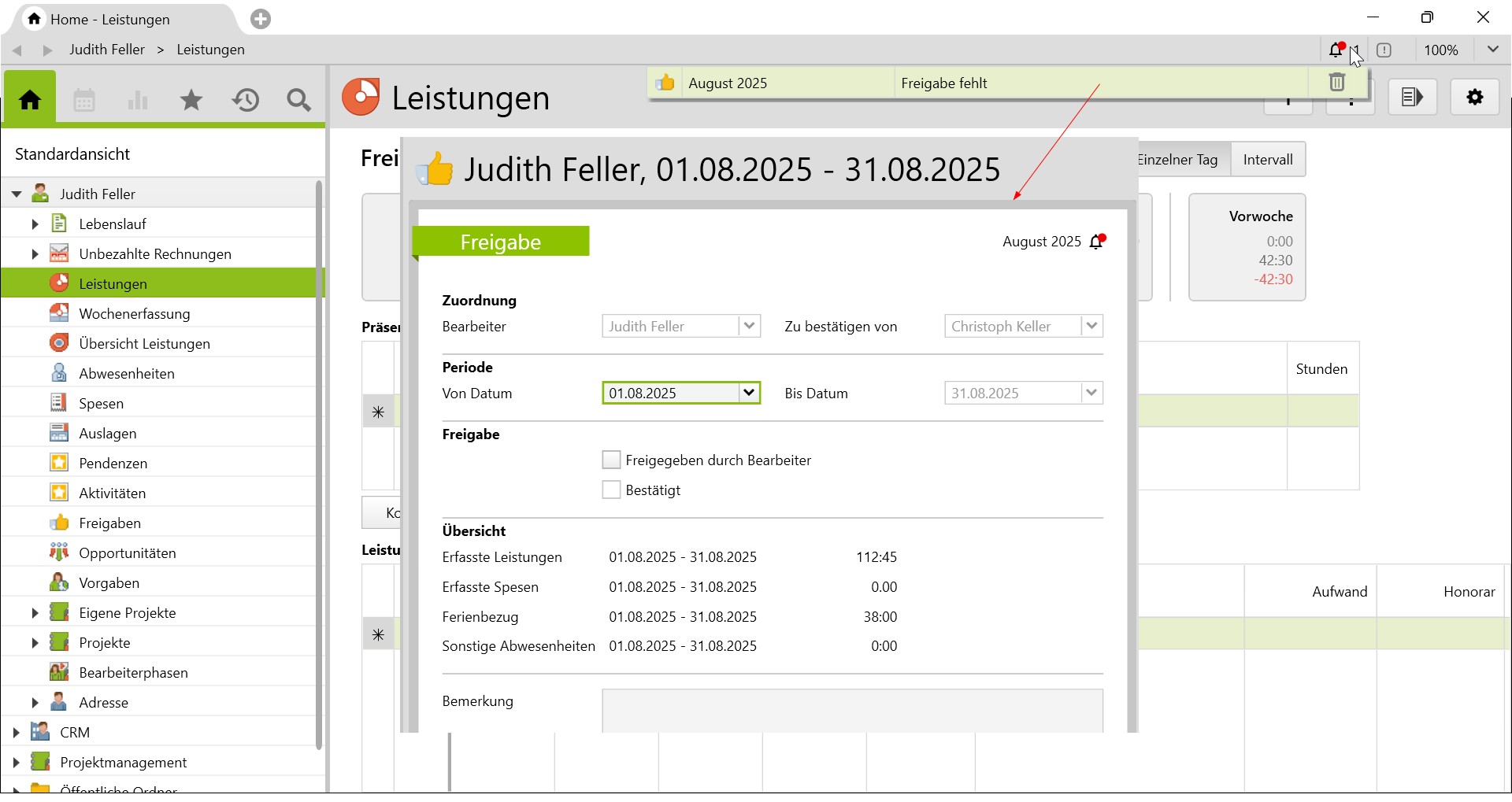 Zusatzfunktion für die Freigabe von Leistungen, Spesen, Auslagen und Abwesenheiten