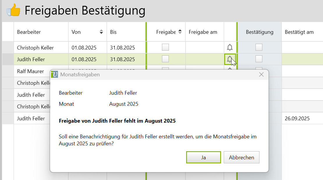 Durch Klick auf das Glockensymbol wird gelistet, welche Freigaben fehlen, und es können Benachrichtigungen geschickt werden: