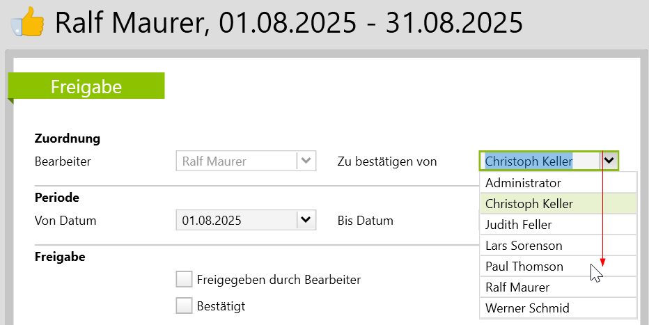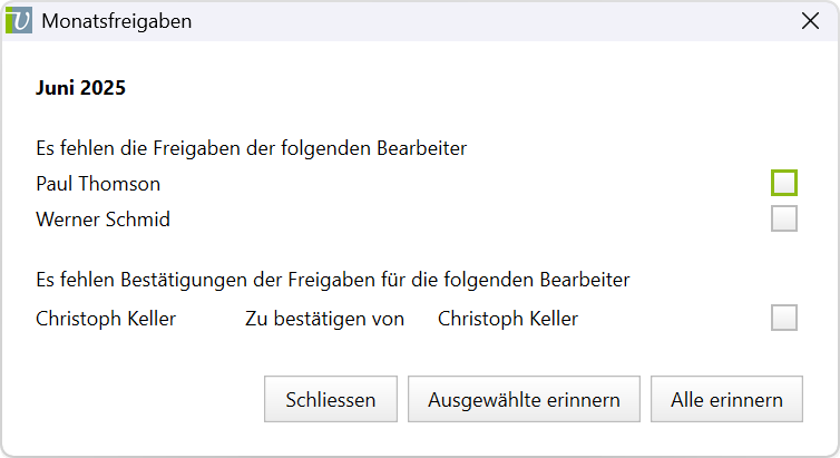 Ist der Bearbeiter über das Monatsende hinaus in den Ferien (oder anderweitig abwesend), kontrolliert er seine Eingaben am Ende seines letzten Arbeitstages und bestätigt seine Freigabe für den Monat.