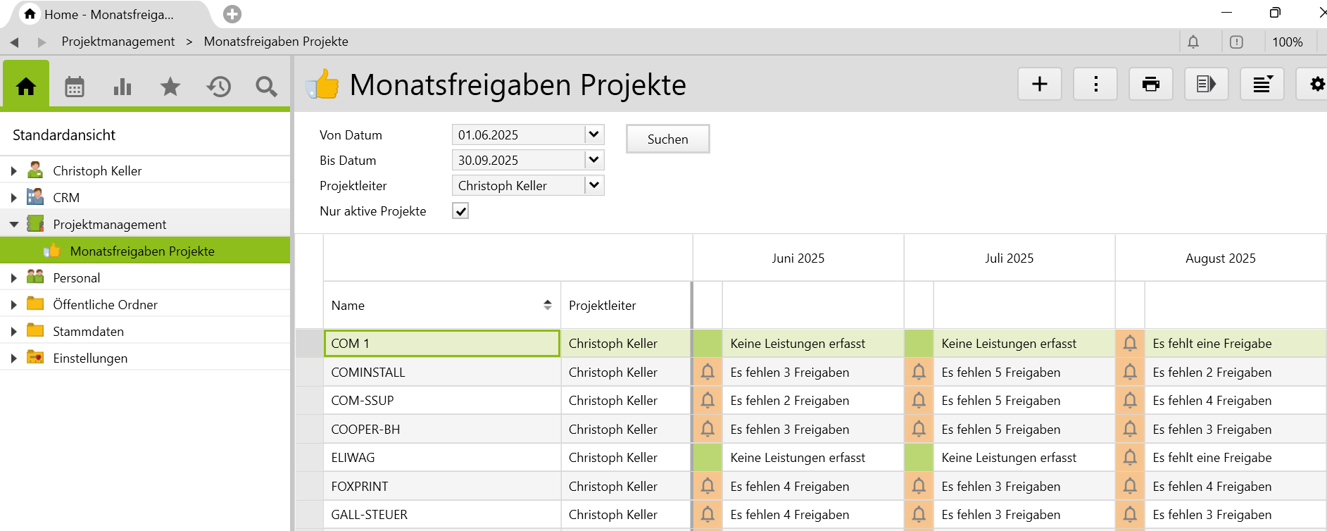 Aus Projektsicht ist es ebenfalls interessant, welche Bearbeiter Ihre Freigaben bereits erstellt haben, insbesondere vor der Rechnungsstellung. Dafür gibt es im Ordner Projektcontrolling eine Liste Monatsfreigaben Projekte: