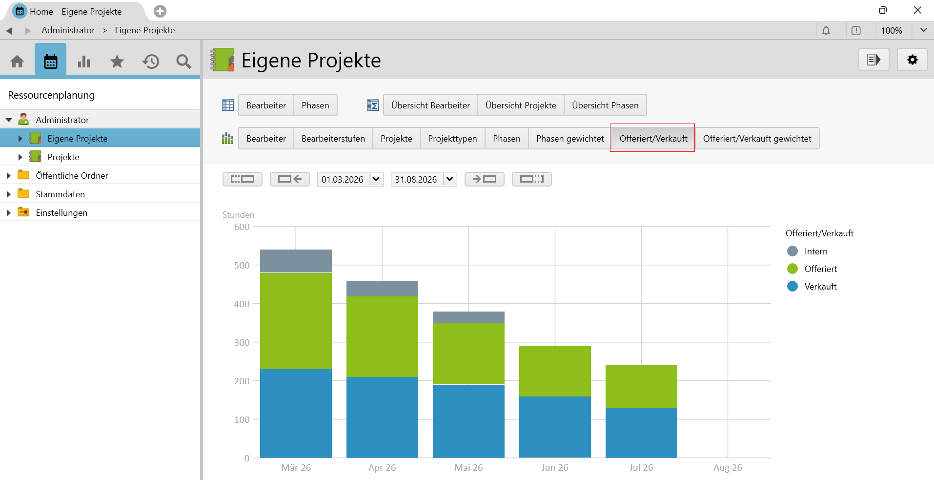 In dieser Darstellung werden im Gegensatz zu Offeriert/Verkauft die auf der Phase angegebenen Wahrscheinlichkeiten berücksichtigt (die geplanten Werten werden multipliziert mit der Wahrscheinlichkeit/100).