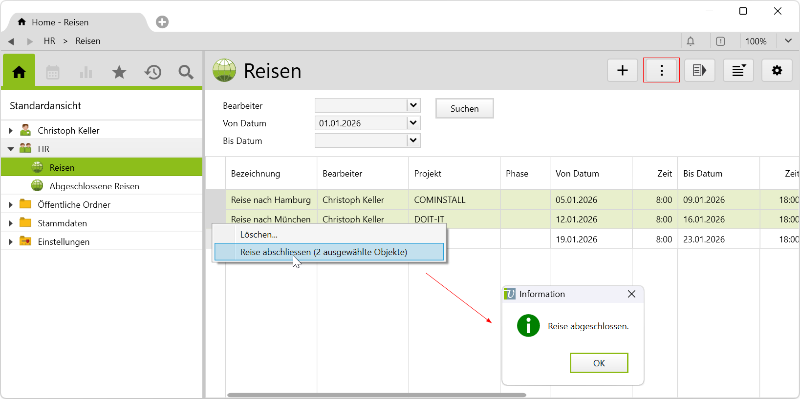 Hierfür markieren Sie alle betroffenen erfassten Reisen unter Reisen und per Rechtsklick oder im Menü Aktionen wählen Sie Reise abschliessen. Anschliessend erscheint die Meldung für die abgeschlossenen Reisen und diese werden im Unterordner Abgeschlossene Reisen verschoben: