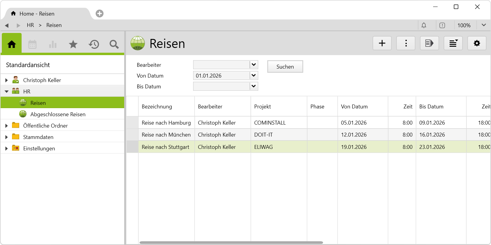 Alle erfassten Reisen sind im Unterordner Reisen im Stammordner HR einsehbar: