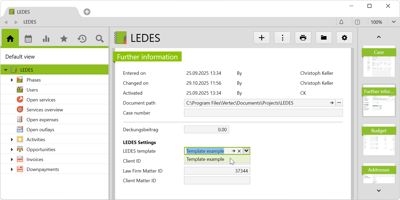 On the case, you can now select the appropriate template on the further information page under LEDES Settings and fill in the fields Client ID, Law Firm Matter ID and Client Matter ID: