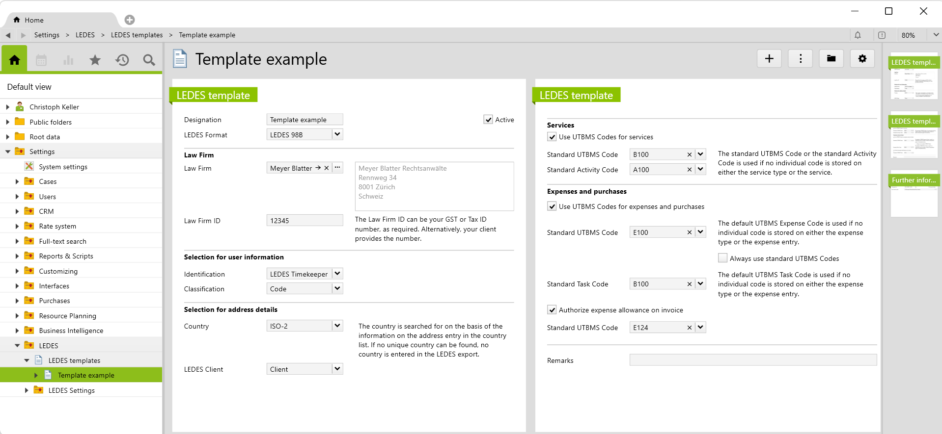 The additional feature implements in the root folder Settings the folder LEDES in which custom LEDES templates can be created and settings can be adjusted. The templates LEDES 98B, 98BI and E-Billing 2.2.1 are generated. The main difference is that e-invoices using the template 98B/98BI are exported in plain text format, whereas those using the template E-Billing are exported in XML format.