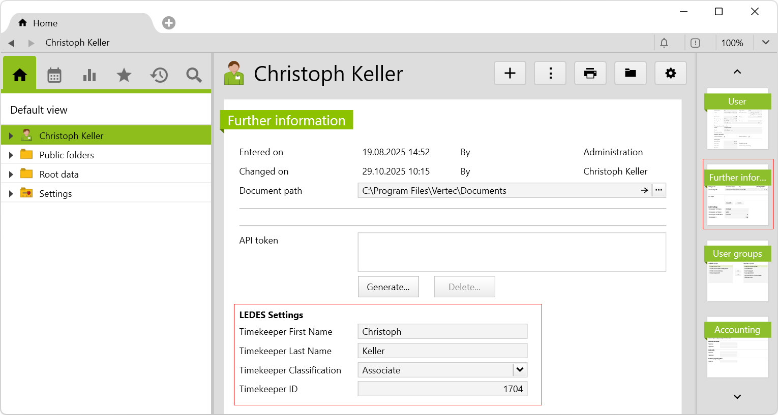 On the user and on the further information page, there is the LEDES settings section, in which the following four fields must be filled in: