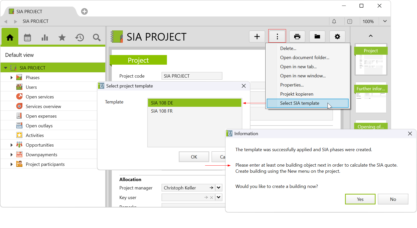 Yes , a building object is created instantly (see next point).Yes, the detail page of the building object opens instantly. New building items can be manually created on the building object via right-click or Menu Actions, or a Template with predefined building items can be selected from the settings:
