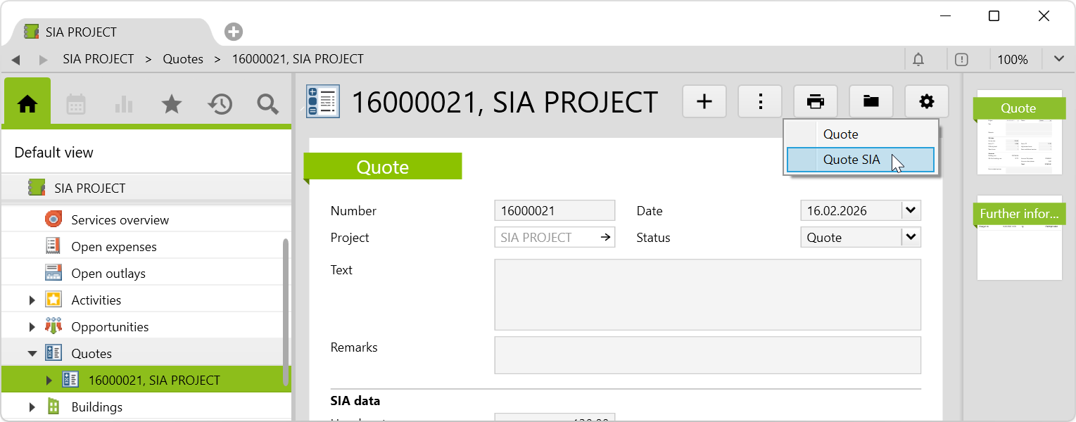 Based on the amounts on the building items of the building object, the budgets for the SIA phases are automatically calculated, which ultimately results in the quote sum.