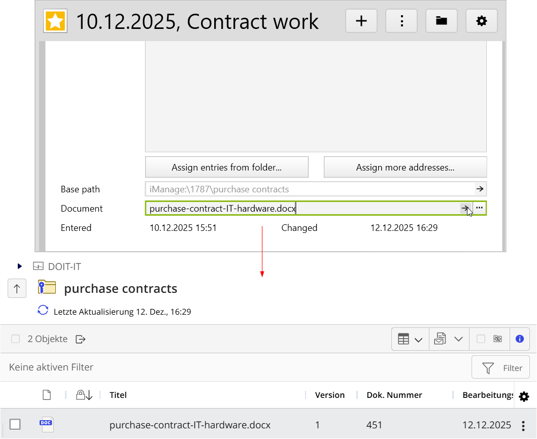 Documents such as invoices or files stored in activities can be opened directly as long as a folder is specified in the document path. It is not possible to open a document in iManage without a folder. Invoices are created via print button and stored in iManage according to the document path.