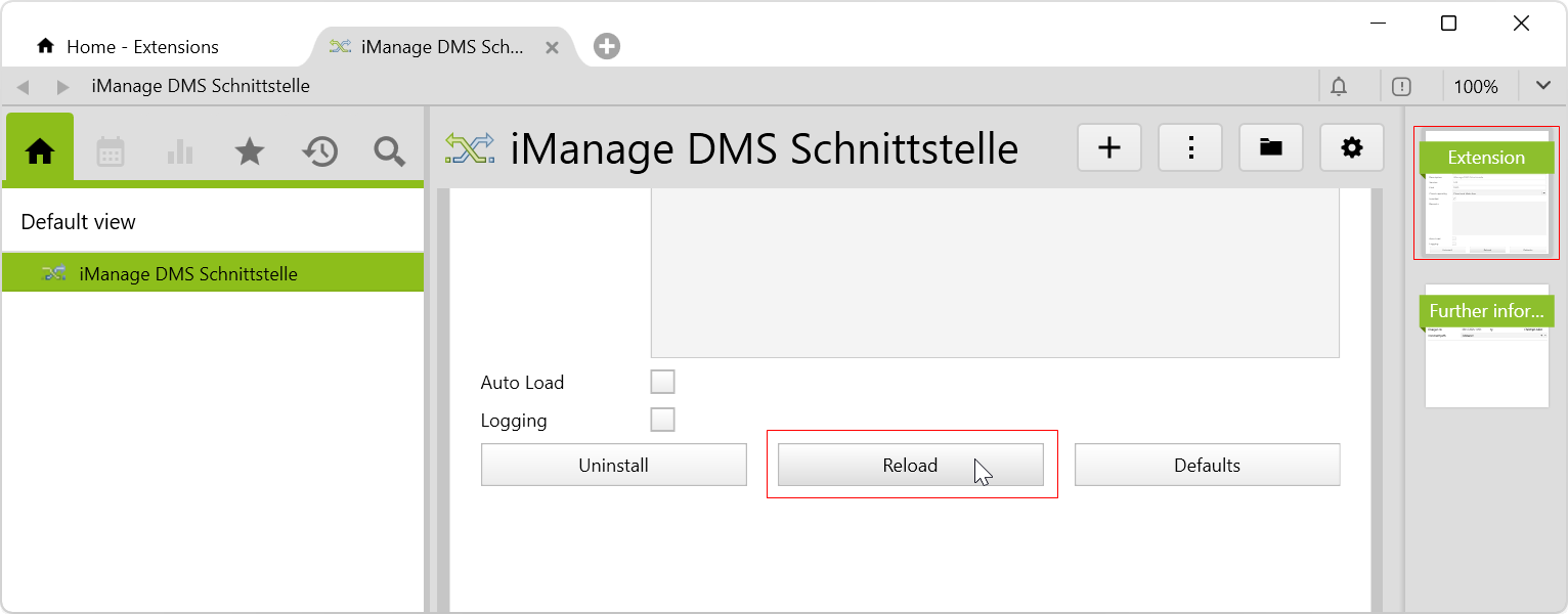 If changes are made in the system settings, the extension should be reloaded each time to ensure that the changes are applied safely. To do so, go to settings > interfaces > extension and click on iManage DMS Schnittstelle. On the first page extension, click on Reload: