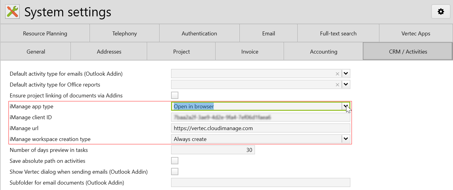 Once you have registered your Vertec in iManage and imported the config set, the credentials must first be entered in the system settings under CRM / Activities. This will initialize the exchange with iManage.