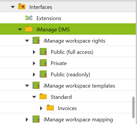 After importing the config set, the iManage DMS folder is created under settings > interfaces with the following subfolders:
