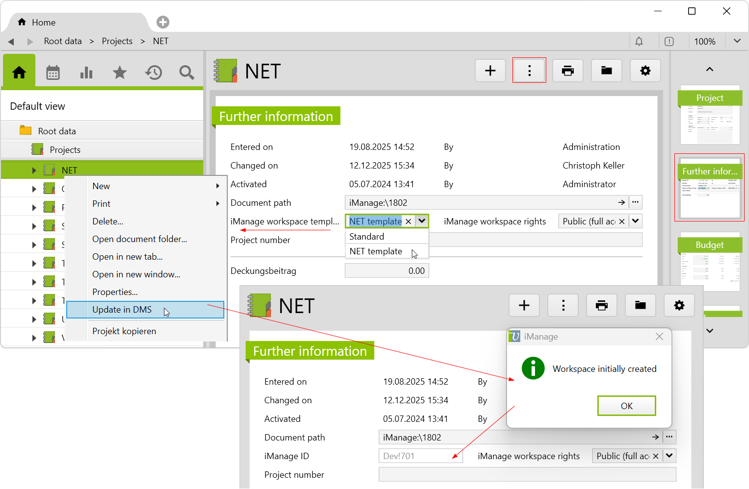 By right-clicking on the project/case or using the actions menu, you select Update in DMS . After the successful update, the message Workspace initially created appears and then the iManage ID is entered on both the further information page and the workspace mapping list.