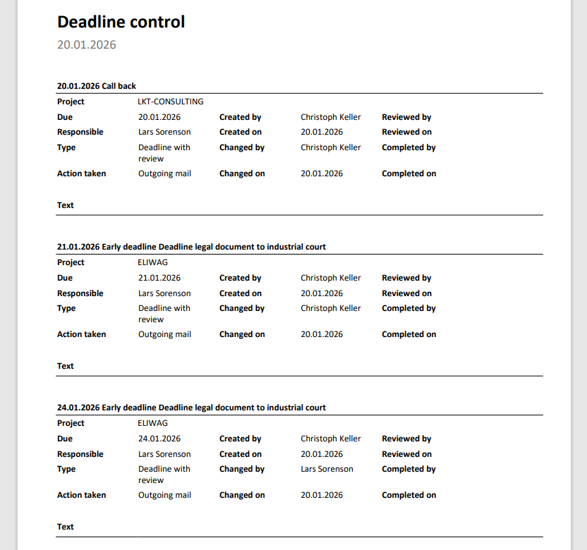 Via the print menu on an individual deadline (activity) or on a list of deadlines, the PDF document Deadline control can be created, if required, which contains the essential elements of the deadline. All users, who have access to activities, can print out these deadline control sheets.