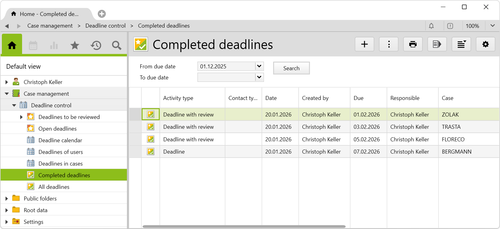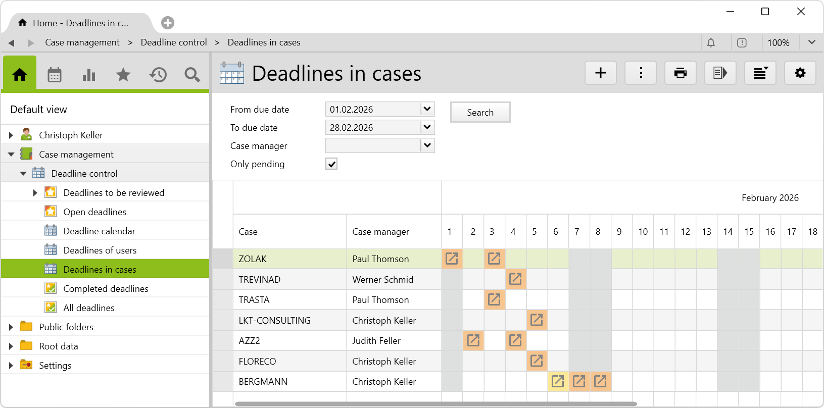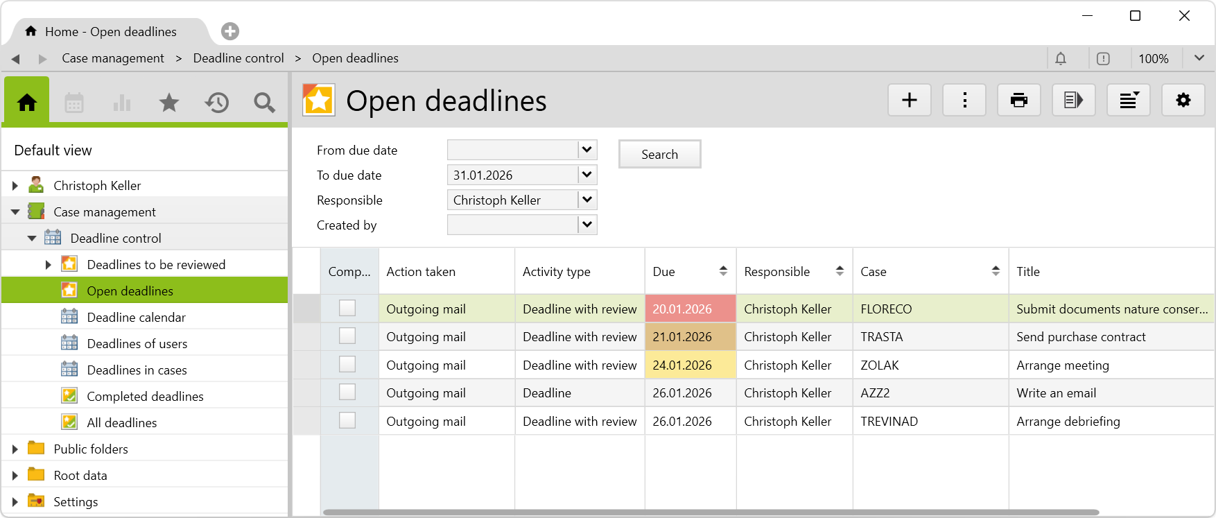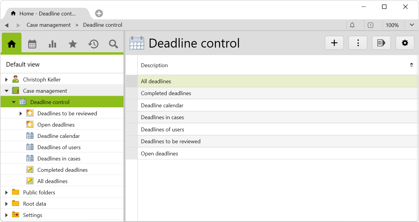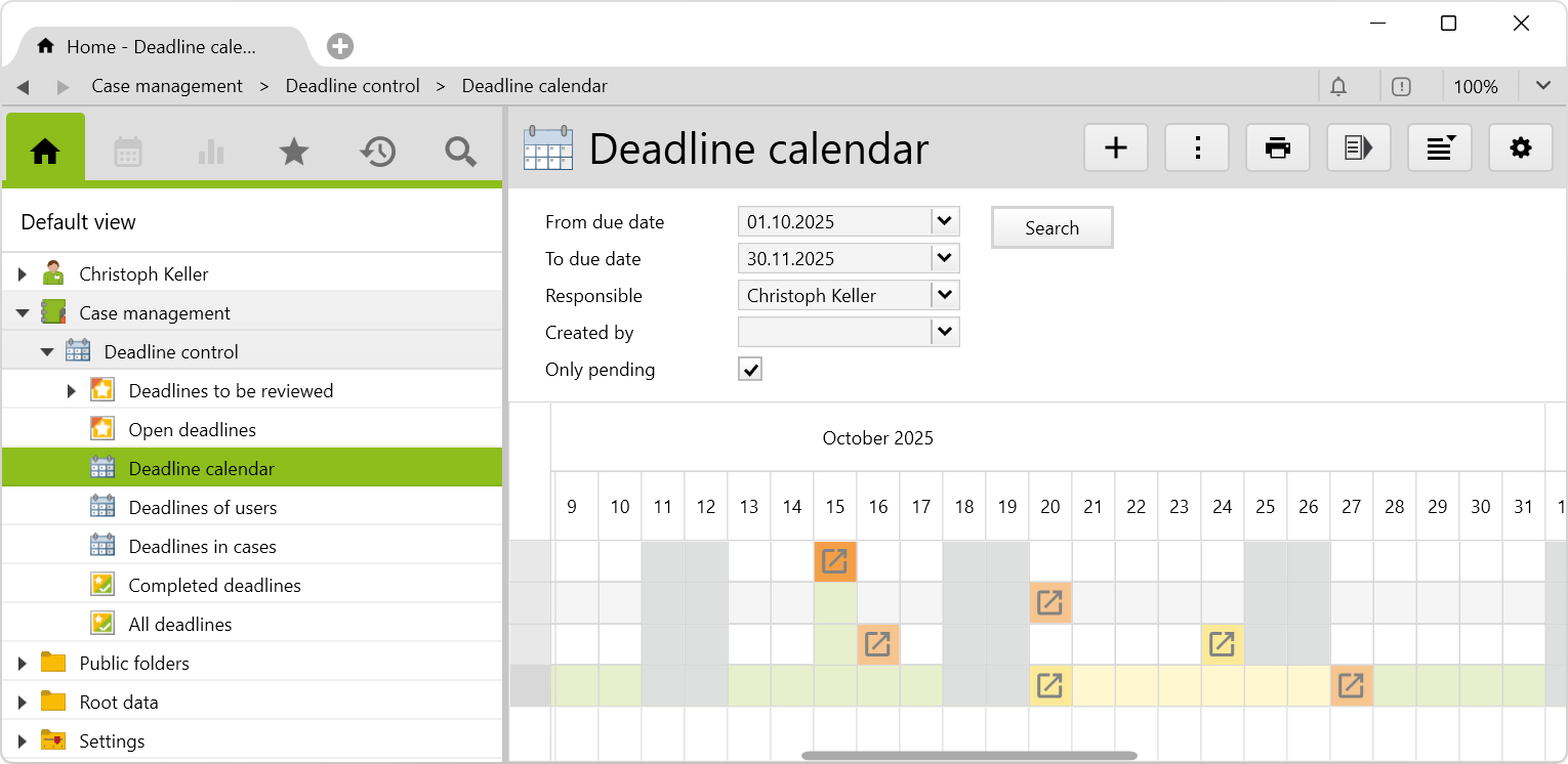 Regardless of whether you work as a lawyer, consultant or in administration, meeting important deadlines is a top priority. With this additional feature, you can create deadlines and early deadlines, and monitor them at all times with clear folders and calendar views. You can find the corresponding config set here.