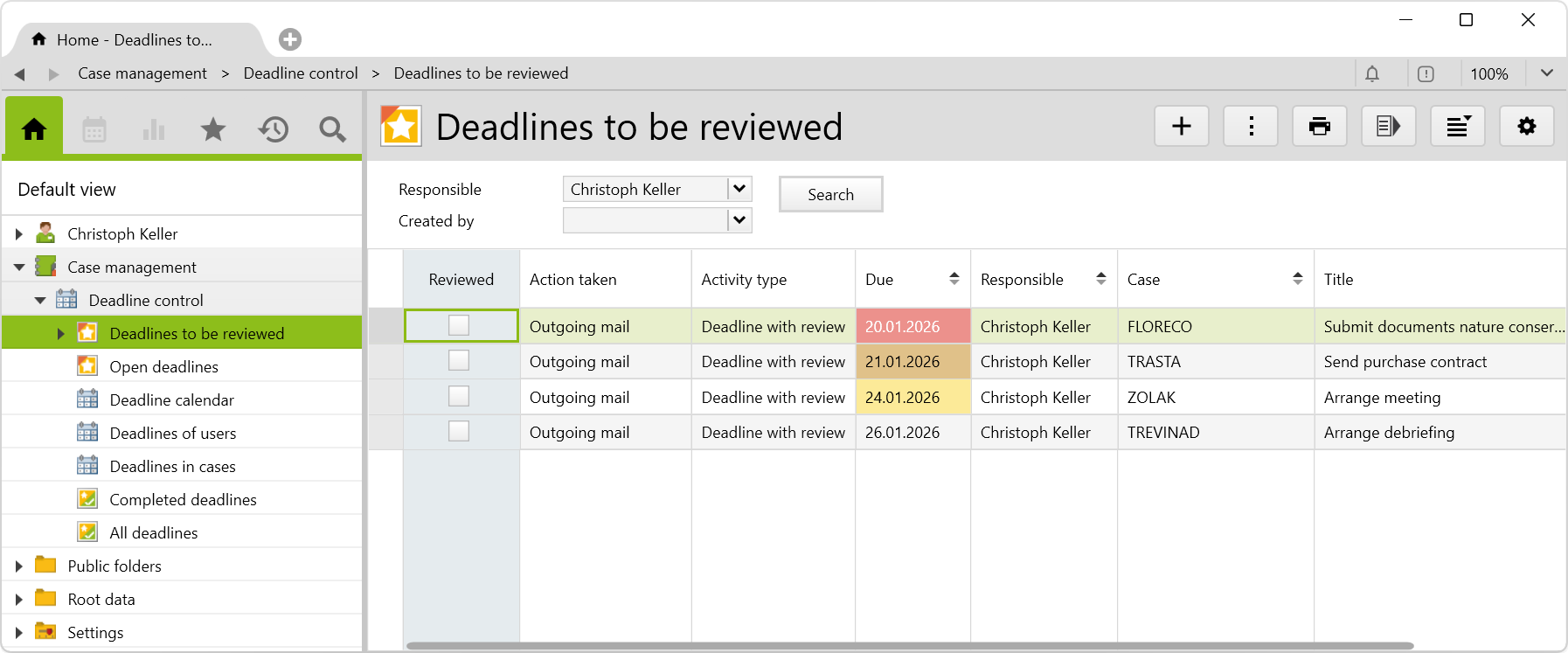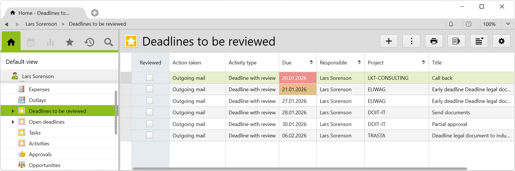 It contains a list with all deadlines to be reviewed, in which the Reviewed checkbox has not been ticked yet. Early deadlines do not appear in this view.