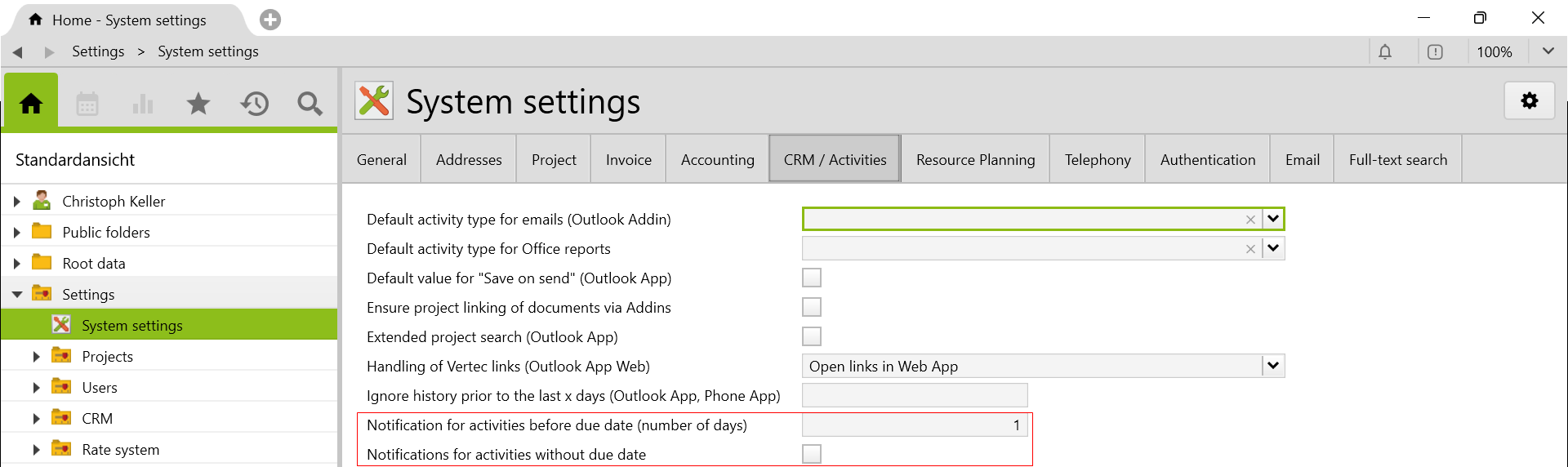 The following settings can be made in the system settings in the Section CRM/Activities: