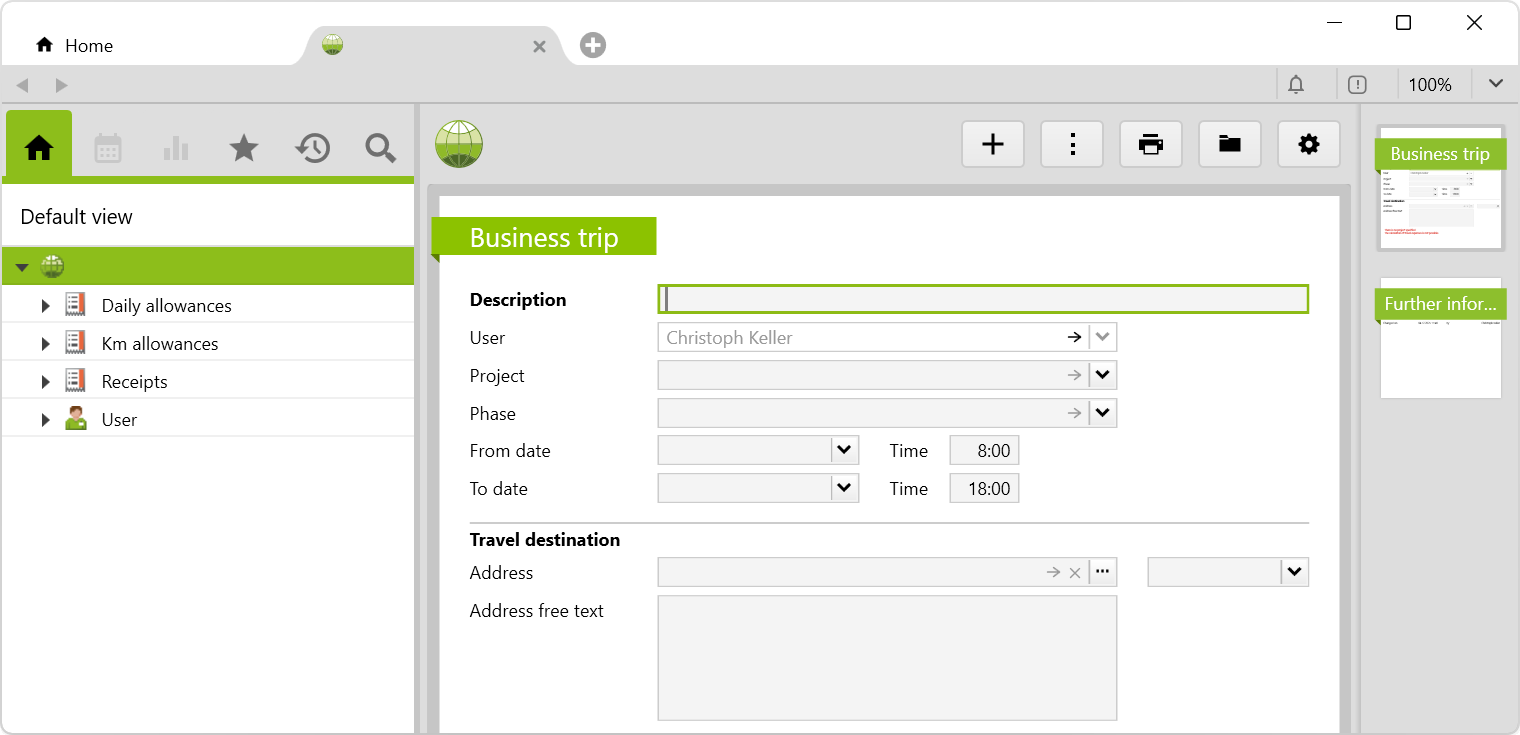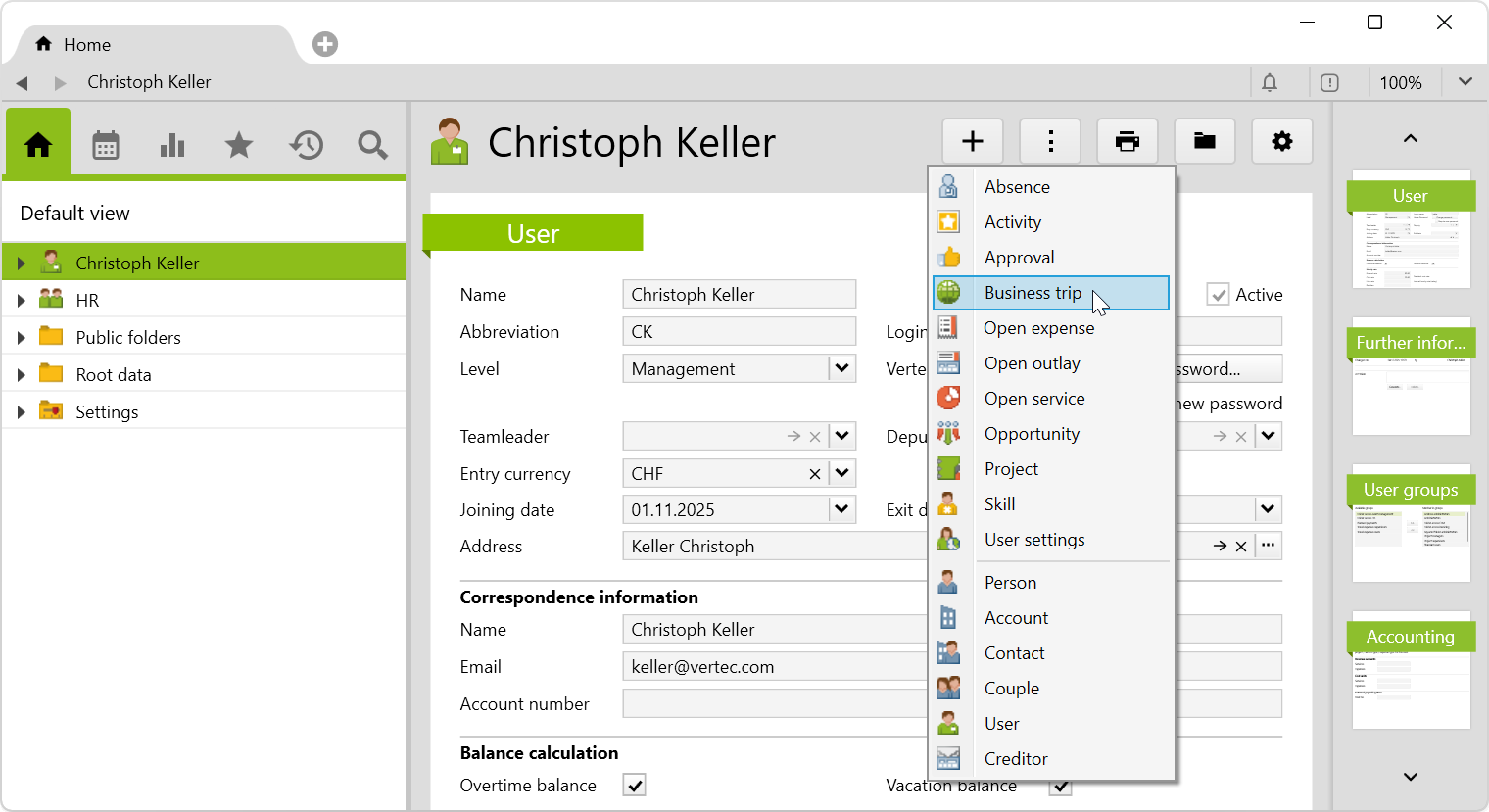 A new trip is created on the user by right-clicking or selecting from the new menu > Business trip: