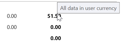 The currency in business trip lists and pages is always specified in the user's currency. If you place the cursor on an amount, a corresponding tooltip appears: