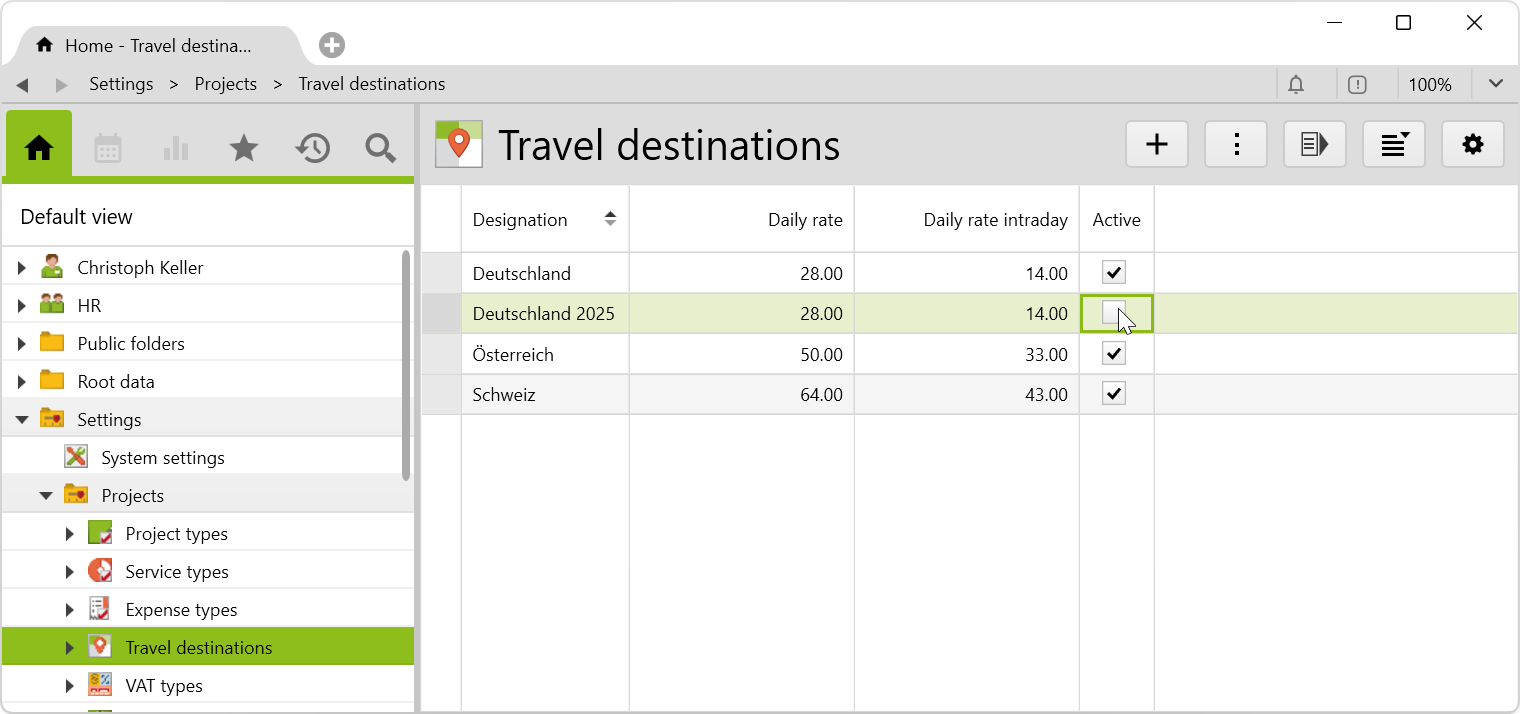In the root folder Settings > Projects > Travel destinations, the destinations and the corresponding daily rates must be entered (Administrators only). Germany, Austria and Switzerland are already predefined. If additional countries or additional rates per country are required, these can be entered here and via Active checkbox activated or deactivated:
