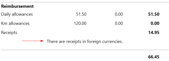 For each trip, the travel expenses report can be created via print menu. All relevant amounts are listed and the amount to be reimbursed to the employee is shown. Deposited expenses receipts are printed in the attachment.