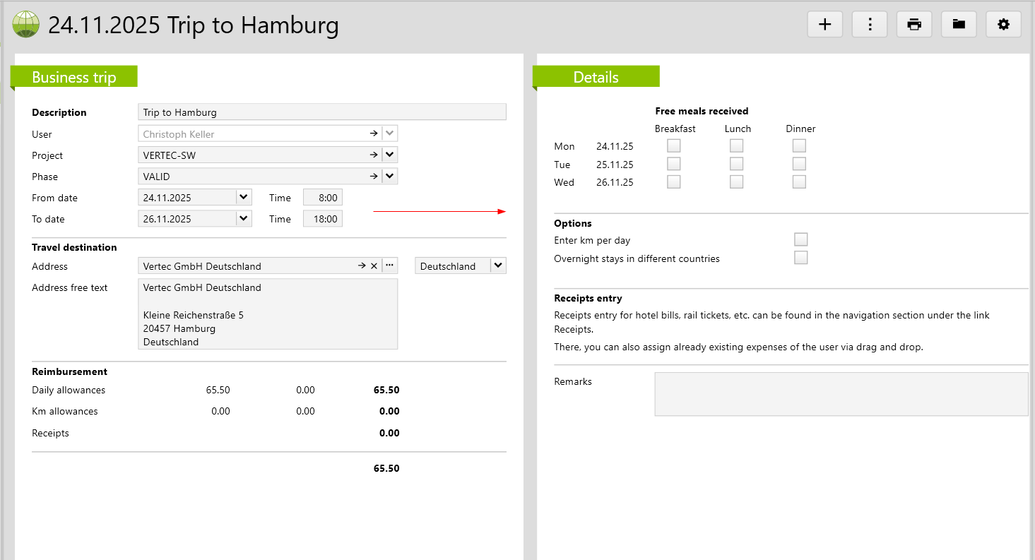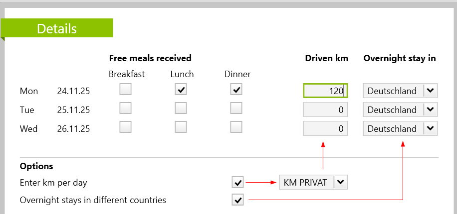 Based on this information, the meal and kilometer flat rates are automatically calculated and the corresponding expense reports are created. For the calculation of the daily allowances for the catering, the daily rates stored in the destinations are relevant. Depending on the destination, the following applies: