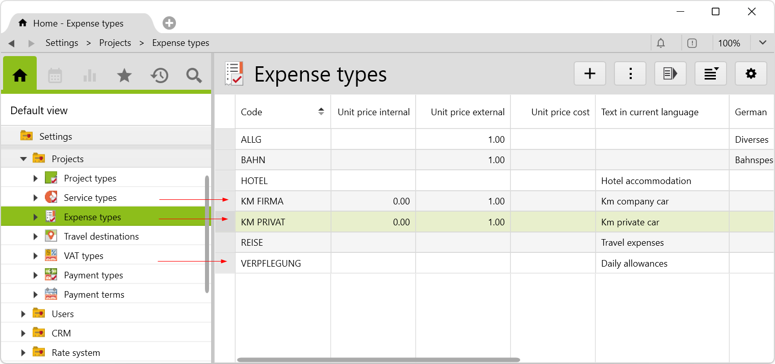 argobject.eintragid="ExpenseTypeKMPRIVAT" or argobject.eintragid="ExpenseTypeKMFIRMA" on the respective expense type.Before importing the config set, we recommend you read the article Key information about the additional features. Config sets modify data in Vertec, which can overwrite existing data.