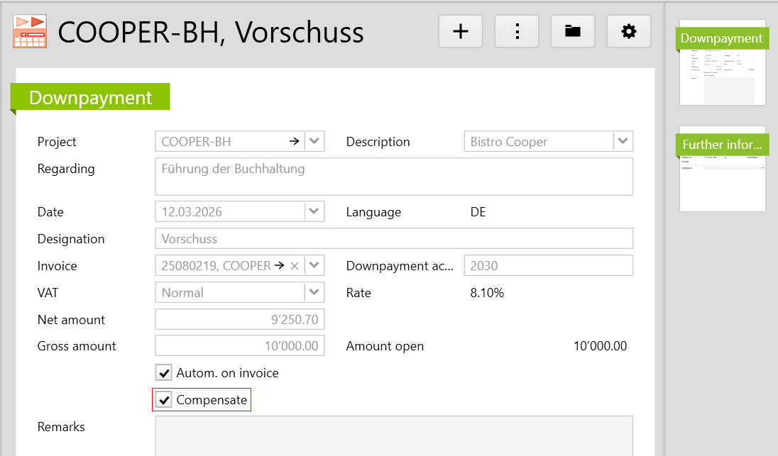 However, if you now want to refund the remaining amount to the customer, the option Compensate must be checked on the corresponding downpayment: